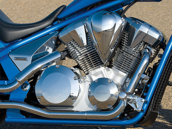 El motor se pone en un nuevo chasis tubular de acero que, con un reparto de la rueda delantera de 21 pulgadas y una grasa trasera de 18 pulgadas, le da una posición en cuclillas-en-el-trasero postura, aireado en la parte delantera. Para que se vea como un helicóptero, Honda le dio una distancia entre ejes y el Lanzamiento / avance 71.2 pulgadas figuras de 38 degrees/4.4 pulgadas. Por cierto, esa es la distancia entre ejes más larga Honda ha puesto nunca en una motocicleta. La energía es entregada a la rueda trasera a través de una transmisión de cinco velocidades y el eje de transmisión muy bien integrado.